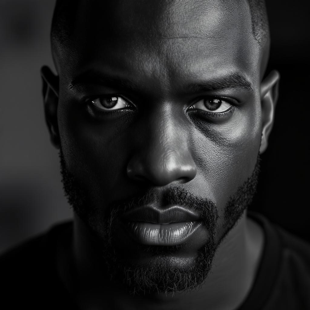 High-resolution wallpaper photo of a black man, looking directly into the camera, intense close-up shot, monochrome, captured with Leica 50mm lens, f1.4, with subtle creative lighting enhancements and rich texture detail.