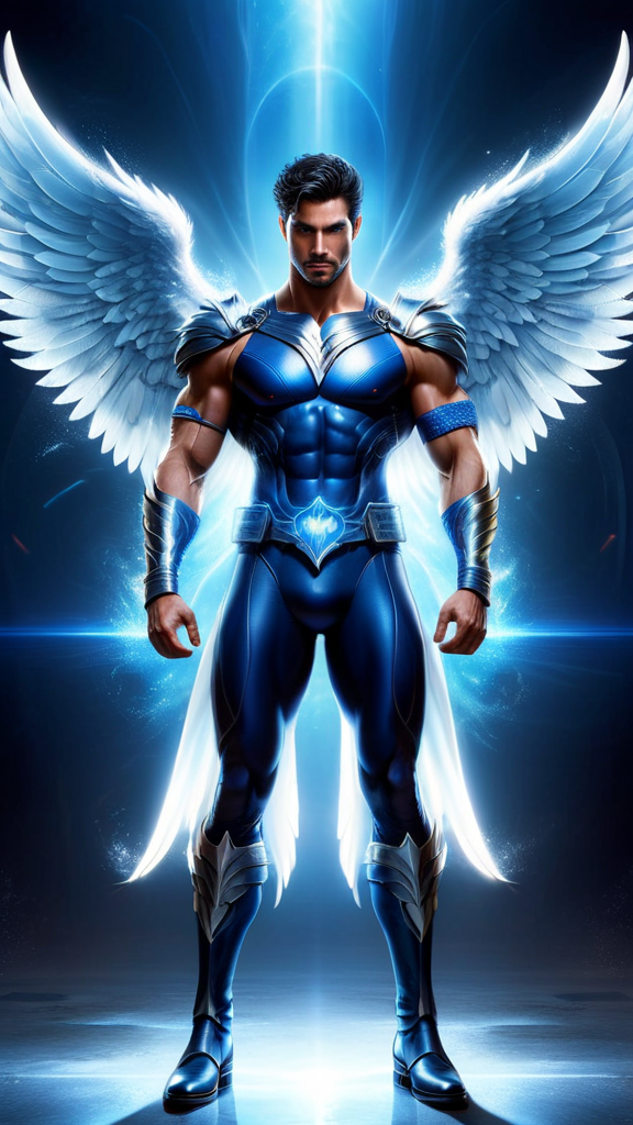 High tech meets mysticism and miracles. Angel, super-hero. He flies to the stratosphere, prays for miracles. Caucasian male of Italian descent. tall, muscular, sinewy, well defined. Short black hair, very short on sides and back, longer on top, touseled waves cimbed back, curly strands falling over ine eye. Icy blue eyes, handsome face, strong brow and jaw, dimpled chin. cobalt blue pauldrons with silver trim on shoulders, silver chrome mask over right eye. Cobalt blue fisnnet shirt, formfit over chest. Silver chrome arm bands and bracers. Silver chrome tech belt with glowing blue light as the belt buckle. Cobalt blue tights stretched over powerful legs, silver chrome jockstrap over top of them. Silver chrome thigh guards and boots. Shiny white Angel wings with blue feathers towards the tips and ends of wings. Full body pose, flying.
