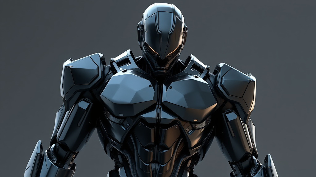 Highly detailed 3D render of a charismatic, muscular humanoid villain robot, featuring sharp lines and dark reflective materials. The robot showcases intricate and tiny details with realistic natural textures and a high level of reflections. The half-body shot captures its commanding presence, while the design integrates subtle geometric patterns and faint metallic hues, adding depth and character to its sleek, futuristic appearance.