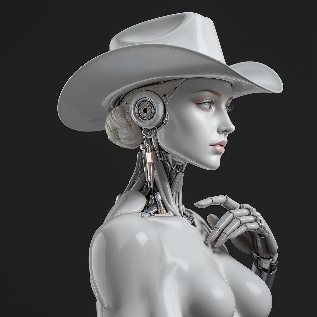 Highly detailed 3D render of a stunning porcelain female robot with intricate features, displaying an ultra-realistic profile. Rendered with 8k UHD and HDR quality, capturing a cowboy shot with notable curves. The creation includes elements of duplication and mutation, featuring a cloned face with subtle variations, including a slightly elongated neck and nuanced hand details. The image is free from low resolution, out-of-frame elements, blurriness, and any digital artifacts such as watermarks, logos, or text. The focus is on maintaining a cohesive and captivating portrayal, distinct from cartoon styles or split images.