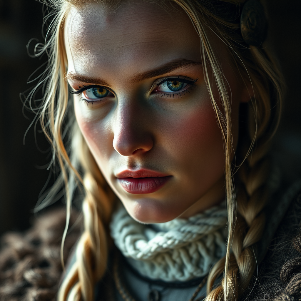 Highly detailed and realistic portrait of a stunning contemporary female Viking, captured in soft natural lighting, with a focus on portrait photography using an 85mm lens. Enchanting photographic elements with dramatic lighting, photo-realistic features, and ultra-detailed textures. Intimate portrait composition with a cinematic touch reminiscent of Cinestill 800T, emphasizing the subject's striking character and modern Viking aesthetic in a 9:16 aspect ratio.