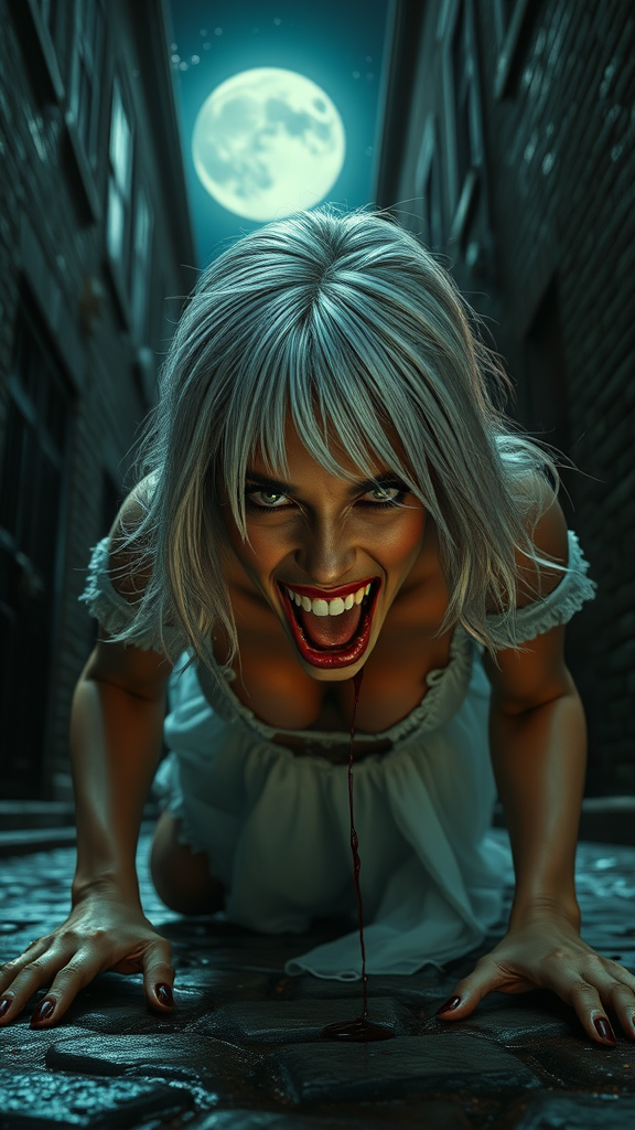 Highly detailed CG unity 8k portrait of a vampire woman poised to bite the viewer in a shadowy Victorian back alley. She has striking silver hair cascading down her shoulders, contrasting with her sun-kissed tan skin. The scene is set under the haunting glow of a full moon and twinkling stars in the night sky. Her white, tattered dress clings to her, giving an ethereal yet eerie presence. She crawls on the cobblestone ground with a predatory elegance, her piercing eyes locked onto her prey. Razor-sharp vampire fangs glisten as blood drips from her open mouth, framed by dramatic, chilling lighting that casts ominous shadows. The atmosphere is intense and captivating, capturing the allure and danger of this nocturnal predator in a style reminiscent of Greg Rutkowski.
