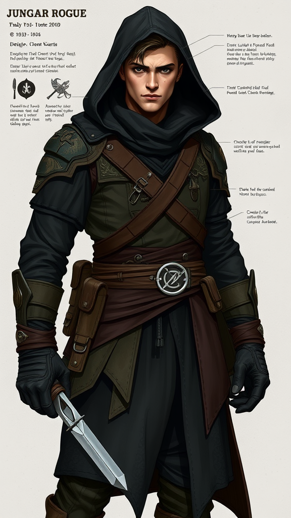 Highly detailed character reference sheet featuring a male rogue with symmetrical facial features, set in a fantasy RPG world. This Dungeons and Dragons-inspired design showcases a full-body depiction emphasizing the rogue's stealthy attire, cunning expression, and agile posture, ideal for tabletop gaming narratives.