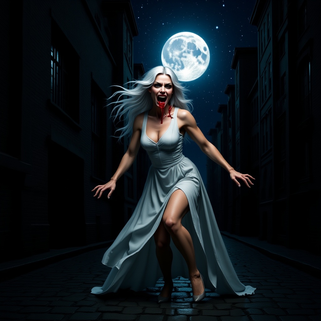 Highly detailed CG unity 8k wallpaper portrait of a vampire woman lunging towards the viewer in a shadowy Victorian back alley, her ghostly white hair cascading wildly, set against a backdrop of an 8k star-studded night sky illuminated by a luminous full moon. Her skin is strikingly tan, contrasting with the tattered remnants of a once-elegant white dress clinging to her form as she prowls on the cobblestone ground. Her mouth is agape, sharp vampire fangs prominently displayed, with fresh blood glistening as it drips down her chin. The scene is rendered with dramatic, almost theatrical lighting, capturing a moment of both beauty and terror, reminiscent of a work by Greg Rutkowski.