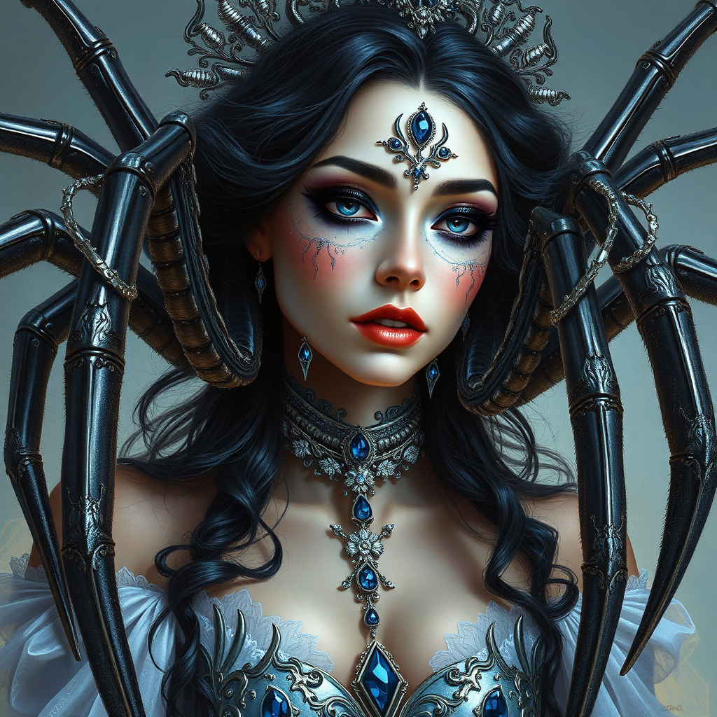 Highly detailed depiction of a regal woman as the queen of spiders, inspired by the mystical essence of eledrae and taijen 3, rendered in the artistic style reminiscent of Boris Vallejo. Her presence is adorned with dark sapphire and silver hues, embodying a polished metamorphosis that captivates the viewer. The artwork features trompe-l'œil illusionistic details, presenting a contemporary embodiment of a spider-woman. Executed with large-scale brushstrokes, the scene offers a unique twist on stripcore aesthetics, maintaining a balance between intricacy and grandeur.