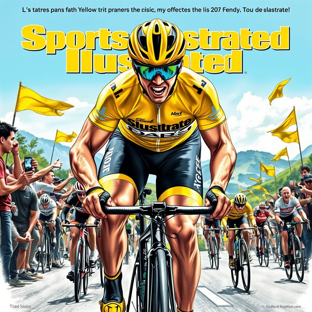 Highly detailed drawing of a Sports Illustrated cover photo featuring the Tour de France with the Yellow Jersey front and center, capturing the essence of intense athletic competitions with a photorealistic style. The cyclist is surrounded by dynamic motion, showcasing powerful muscles and determination, set against a backdrop of scenic French landscapes. The sunlight casts dramatic shadows, enhancing the rider's focus and the vibrancy of the jersey. The atmosphere captures the thrill and endurance of the race, with subtle creative elements like spectators cheering in the background and fluttering flags adding to the moment's energy and excitement.