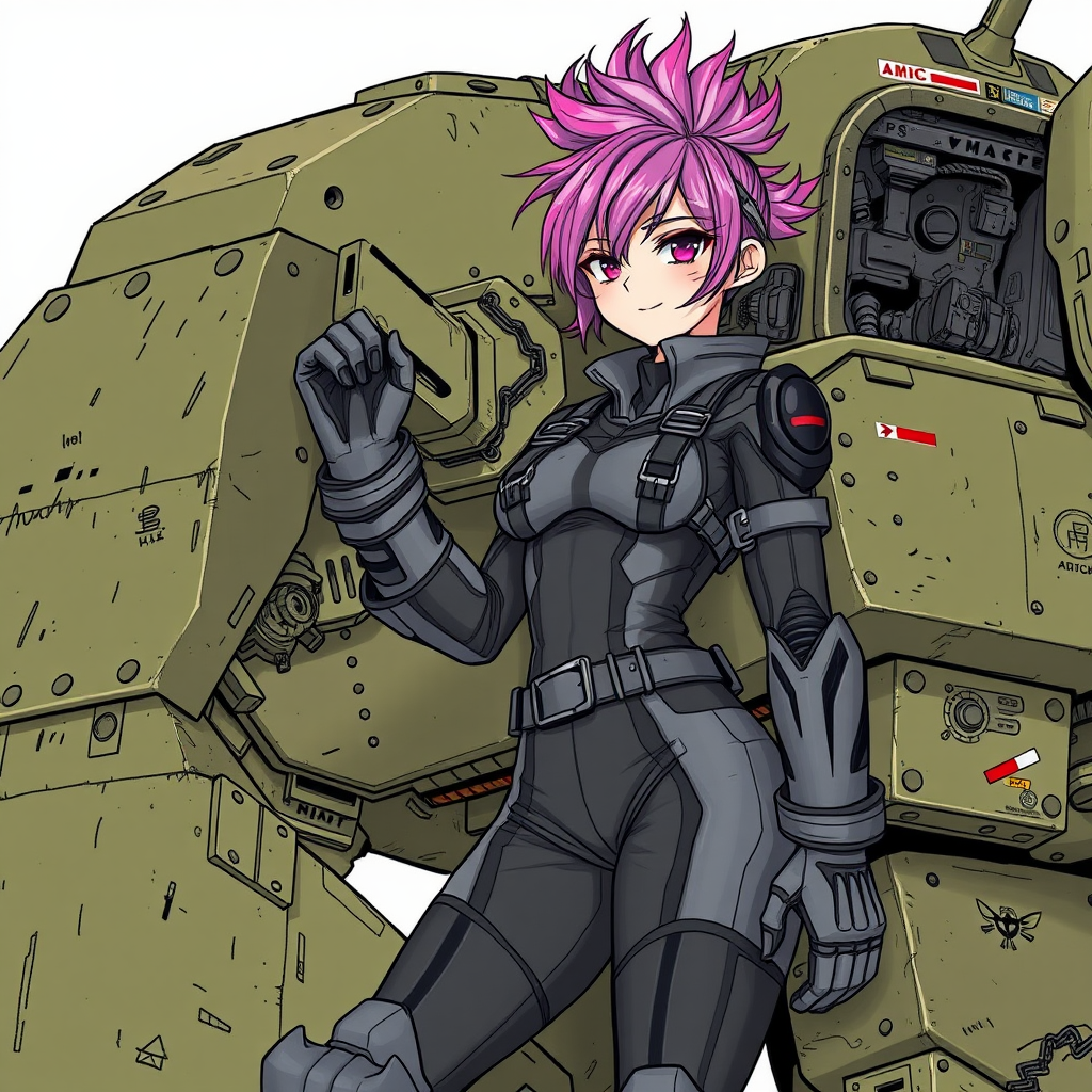 highly-detailed graphic novel illustration of a punk cute girl mecha pilot in a tank girl style, wearing a hyper-detailed, smooth, and stealthy body-tight jumpsuit in a muted grey and black color scheme, with intricate paneling, buckles, and embellishments that blend seamlessly into her skin, with matching knee pads, elbow caps, and gauntlets that resemble a cross between a power suit and a fishnet stockings. She holds onto the limb of her olive-green mecha robot, a heavily-weathered and battle-scarred war machine with scratched and scuffed armor panels, rivets, and visible screws, with decals and patches from various military units and victories etched into its surface. The mecha's cockpit is partially open, revealing a complex array of instruments, wires, and hydraulics within. The pilot's hair is styled in a spiky and colorful pompadour, with strands framing her face and a few errant strands stuck to her cheeks, hinting at the turbulent and dynamic motion of the mecha. Her expression is one of determination and resolve, with a raised eyebrow and a firm jawline that suggests she's ready to take on whatever battle lies ahead. Her eyes are rimmed with a smudge of black eyeliner, giving her an air of toughness and edge, while a few light freckles on her cheeks add a touch of vulnerability. A futuristic helmet leans against her arm, its surface etched with an intricate network of lines, symbols, and patterns that seem to shift and shimmer in the light. In the background, a haze of smoke and debris hangs in the air, with the faint outlines of ruined buildings and crumbling structures visible in the distance. The entire scene is bathed in a cool, muted palette with hints of warmth and sunlight, with the majority of the image in shades of grey and black punctuated by touches of olive green, scarlet red, and deep blue that evoke a sense of gritty realism and high-octane action.