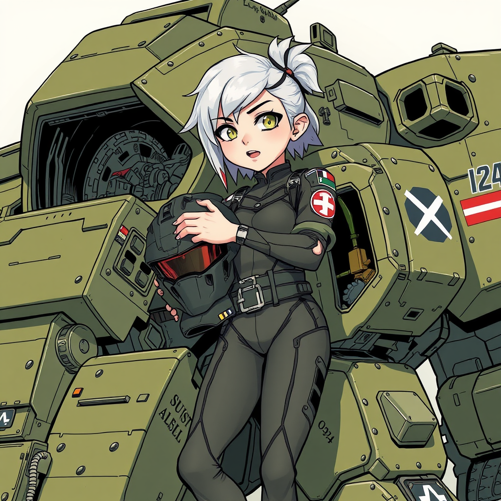 Highly-detailed graphic novel illustration of a punk-cute girl with a playful demeanor, leaning on her rugged military battle mecha, preparing to enter the open cockpit. She dons a meticulously designed, seamless symbiotic body-tight jumpsuit and cradles a sleek futuristic helmet in her arm. The olive-green mecha displays signs of battle wear and various patches, giving it a seasoned appearance. Illustrated in a style reminiscent of Jamie Hewlett and the Gorillaz, with influences from Ashley Wood and the dynamic artstation comic art scene. The artwork is hyper-detailed with super-resolution quality, capturing the essence of a vibrant and edgy world.