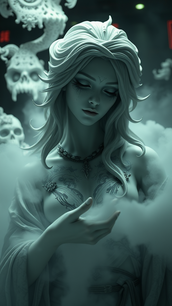 Highly detailed marble and jade sculpture of a female necromancer, enveloped in volumetric fog, exhibiting breathtaking hyperrealism and ultra-realistic elements. Rendered using Unreal Engine, the sculpture is set against a cyber background with cinematic lighting that enhances its intricate details. The environment is stunning and immersive, captured in a wide-angle CGI that blurs the lines between doll-like features and 3D artistry. Octane render techniques highlight the fusion of cartoon, anime, and illustration styles, resulting in a mesmerizing digital painting. The necromancer is masterfully crafted with careful attention to anatomy and proportions, avoiding common rendering flaws like extra limbs or mutated features, ensuring a flawless composition with a focus on elegance and surreal beauty.