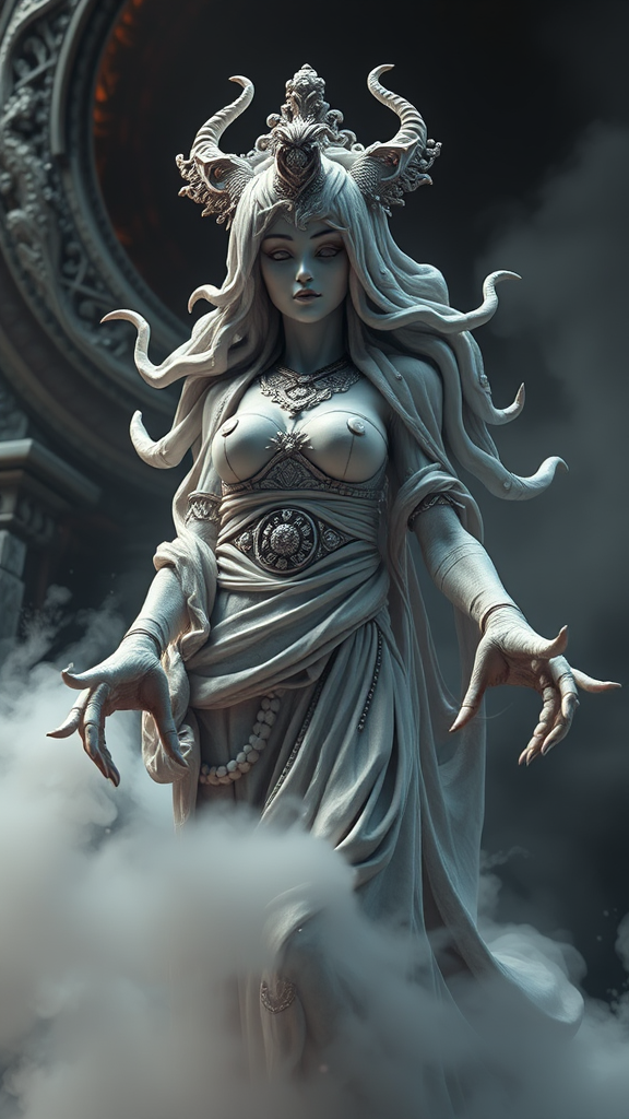 Highly detailed marble and jade sculpture of a mystical female necromancer, enveloped in a swirling volumetric fog, captured with hyperrealistic precision. A breathtaking and ultra-realistic creation rendered using unreal engine, showcasing an ultra detailed, cyberpunk-inspired background. The scene is illuminated with cinematic lighting, presenting a stunning environment akin to high-end photography. Wide-angle CGI techniques bring depth to this 3D masterpiece, designed with intricate detail by octane render. Despite minor anomalies like extra arms or fingers, and slightly disfigured or mutated features, the overall composition remains captivating and awe-inspiring.