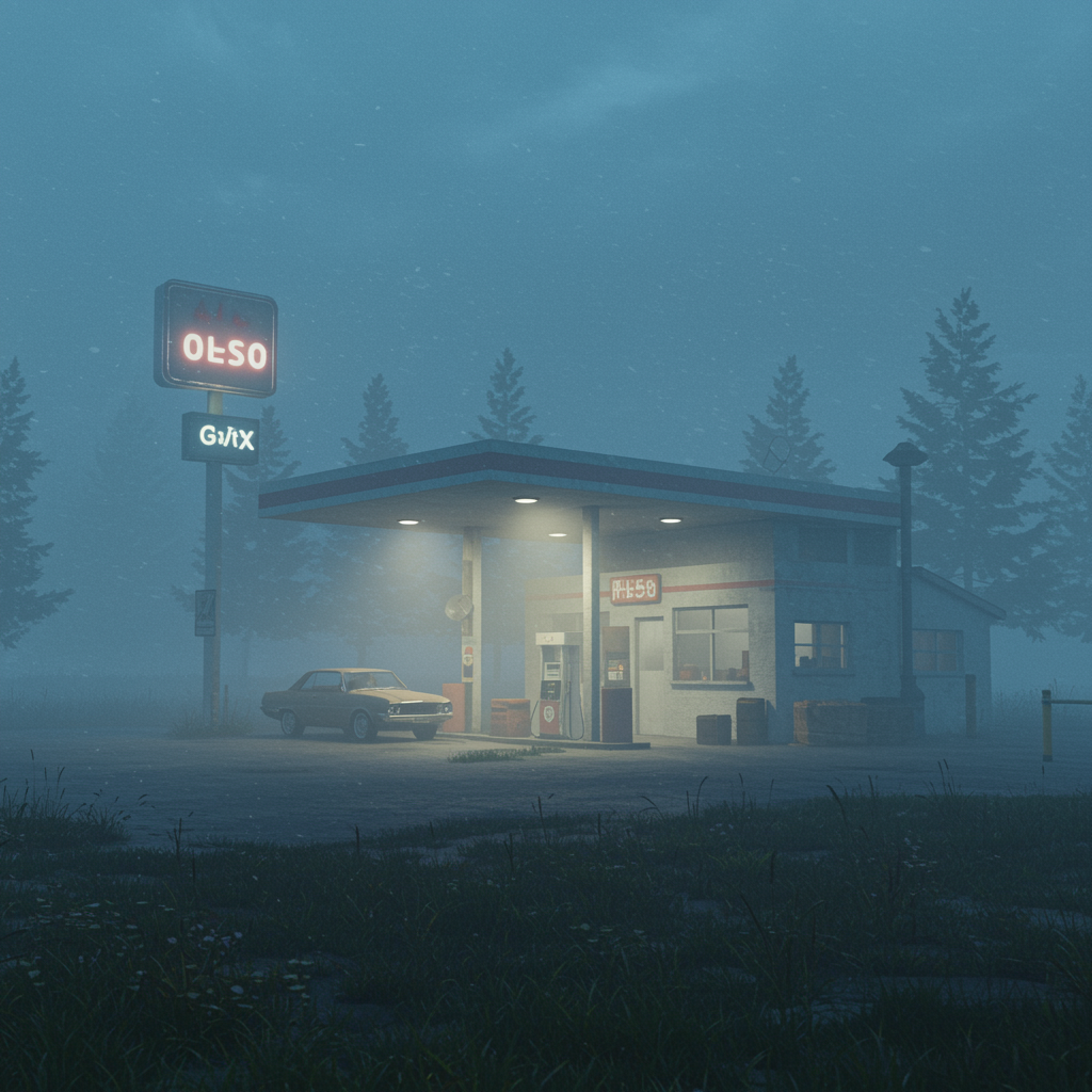 A serene, highly detailed matte painting of a solitary gas station enveloped in a gentle fog reminiscent of Studio Ghibli's ethereal quality, with Makoto Shinkai's signature atmospheric depth. The scene features the artistic sensibilities of Artgerm and WLOP, combined with Greg Rutkowski's intricate brushwork, infused with volumetric lighting that bathes the scene in a dreamy glow. Rendered in 4K resolution, the image maintains a sense of tranquility and mystery, capturing the enchanting isolation of the gas station amidst a tranquil landscape. The soft glow of the station's sign pierces through the mist, hinting at late-night travelers or early morning wanderers. An array of subtle textures and atmospheric details invoke a sense of nostalgia and serenity, making the composition both evocative and captivating, trending on ArtStation.