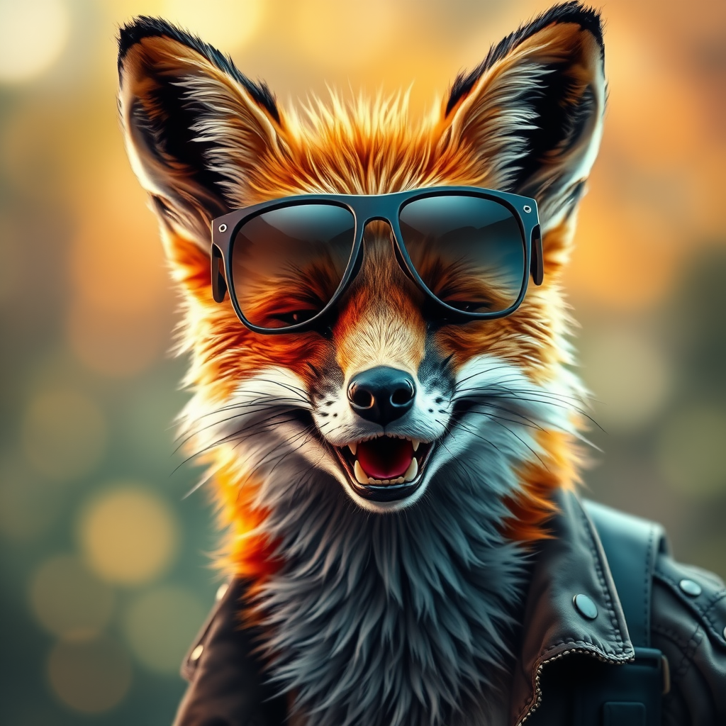 Highly detailed matte painting depicting a three-quarters portrait of a charismatic anthropomorphic fox with a rugged yet joyful expression. The fox dons sleek, reflective sunglasses, adding a playful and cool demeanor to its personality. Its fur showcases a rich tapestry of natural hues, accentuating its earthy charm. The background features an artfully blurred bokeh effect, gently highlighting the vibrant ambiance without detracting from the fox's captivating presence.