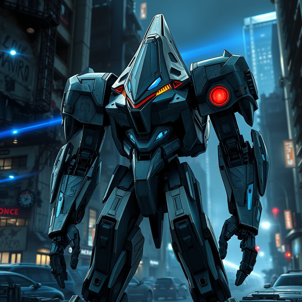Highly detailed mech featuring a triangular head with titanium armor and sharp, angular shapes. Set in a cyberpunk world with a dramatic, dark background highlighting blue energy against a backdrop of ruined futuristic city buildings. The mech stands on a city street with a cold, looming presence. It embodies anime and manga influences, showcasing a gigantism aspect with a focus on triangular motifs and muted colors. Blue and bright lighting illuminate from one angle, enhancing the intricate details and sharp angles. The high-rise urban environment casts sharp shadows with a blurred background contributing to the futuristic ambiance. Elements of science fiction are evident through hyper-detailed beams of energy and sudden flashes of light. Rounded shapes with red accents add contrast, illuminating round elements. The scene avoids deformed or disfigured anatomy, maintaining clean, coherent lines and proportions. The visuals steer clear of oversaturation, emphasizing natural light and round elements like windows, while capturing the mech's lifeless, yet striking expression.