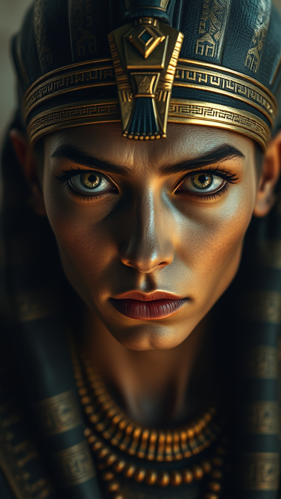 Highly detailed mysterious Egyptian figure, featuring subtle skindentation, captivating bright eyes set against an ancient pyramid background, rendered in a photorealistic and cinematic style. The scene is lit with dramatic, cinematic lighting, creating a sense of awe and wonder. This masterpiece is inspired by the allure of ancient Egypt, with artistic influences that challenge traditional conventions.