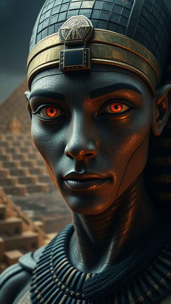 Highly detailed mysterious Egyptian figure, with intricate skindentation; displaying bright, captivating eyes against an ancient Egyptian pyramid background. The scene is rendered in a photorealistic style, with a cinematic lighting creating a masterpiece ambiance. The depiction subtly embraces elements of a flawed artistic touch, capturing an intriguing yet imperfect essence, as if painted by an unconventional artist.