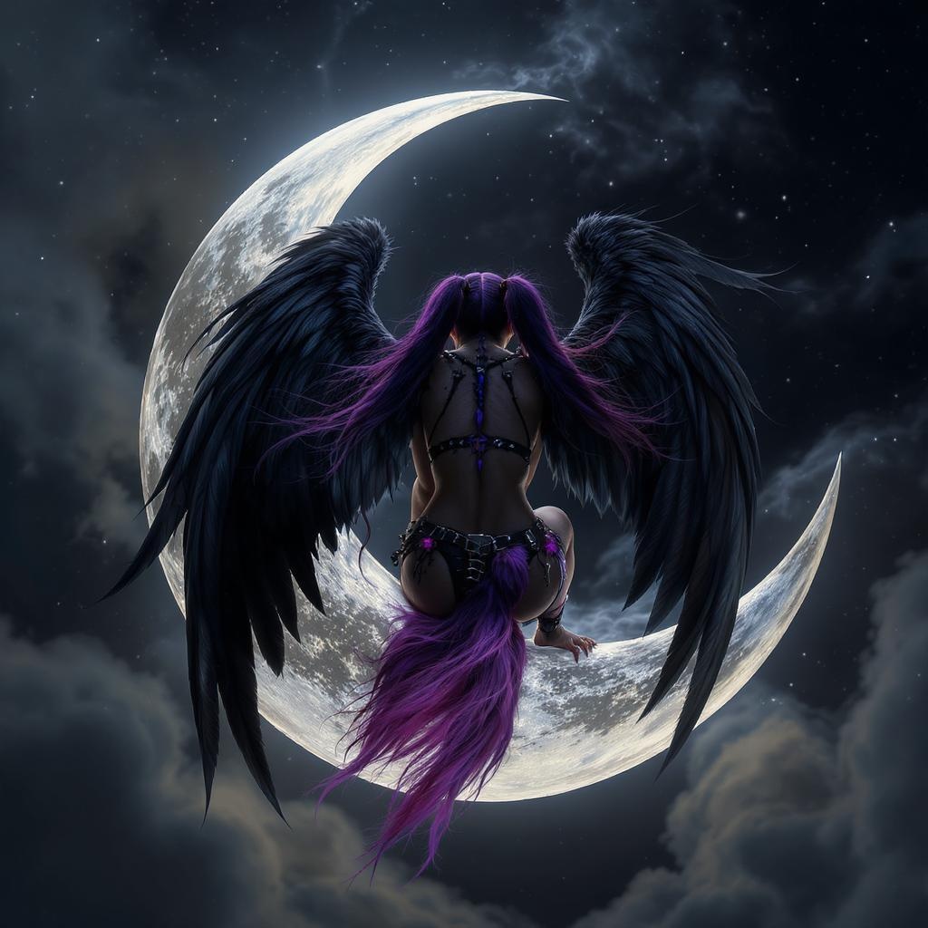 Highly detailed, photorealistic image of a stunning punk angel from a back perspective, gracefully perched on a crescent moon, surrounded by a night sky. She wears striking purple and black punk attire, with imposing black wings and long, flowing pigtails. The atmosphere is haunting with a blurry, abstract background, capturing an angsty vibe. The scene is expertly captured with dynamic lighting and intricate details in 16k resolution. The composition is sharp and clean, with a hyperrealistic focus and an artistic bokeh effect. The image boasts perfect composition, high contrast, and vibrant, bold colors with a touch of film grain.