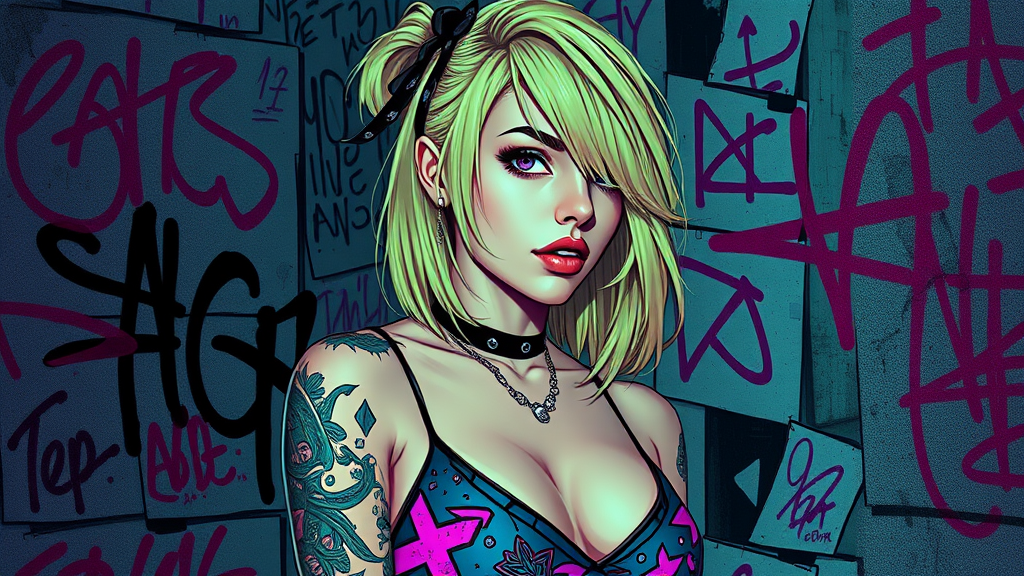 highly detailed portrait of a blonde tattooed girl in a mini dress inspired by atey ghailan, greg rutkowski, greg tocchini, james gilleard, joe fenton, kaethe butcher, featuring a gradient of green, black, and purple with neon color accents and a grunge aesthetic. The scene is set against a graffiti-tagged nightclub wall background. Be mindful of avoiding artistic pitfalls like low resolution, text errors, cropping issues, and visual distortions such as extra limbs or deformed features. Ensure well-proportioned anatomy, clear details, and dynamic expression.