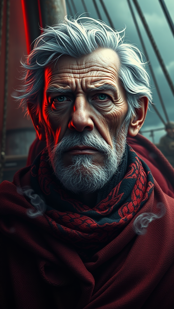Highly detailed portrait of an elderly Pierce Brosnan as an old sailor, vividly rendered by artists like Dustin Nguyen, Akihiko Yoshida, Greg Tocchini, Greg Rutkowski, and Cliff Chiang. The image captures an epic extreme long shot in a Dishonored and Bravely Default-inspired style. It combines a vibrant yet dreary red, black and white color scheme, evoking a dark mood with strong backlighting. Volumetric lights and swirling smoke volutes add depth to the scene, all achieved with ArtStation-level quality, using Unreal Engine and Octane Renderer for an 8K high-resolution finish, creating an atmospheric and evocative depiction of a seasoned mariner facing the elements.