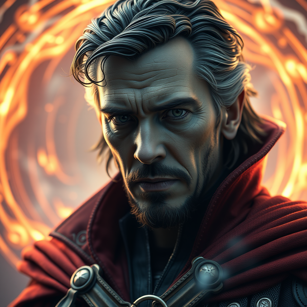 Highly detailed portrait of Doctor Strange, hyperrealism, cinematic lighting, intricate textures, slight motion blur, stoic expression, rendered in 8k, swirling mystical portal in the background, created with Unreal Engine, ethereal energy subtly illuminating the scene.
