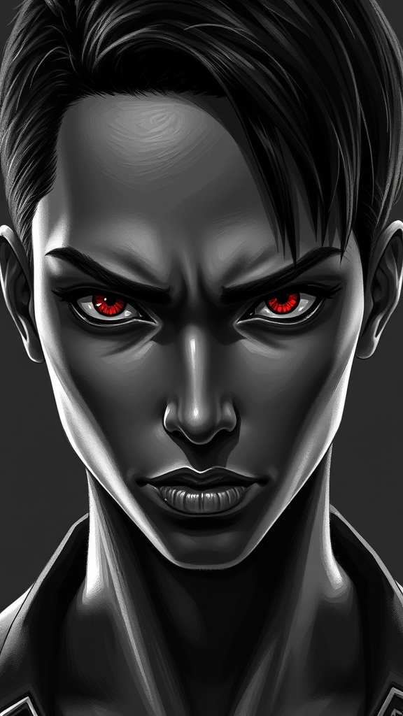 Highly detailed portrait of Levi Ackerman from Attack on Titan, featuring an intense expression with short hair and clean shaven, having deep, richly detailed skin. The digital painting portrays elements of a black woman and a Chinese woman, rendered in monochrome black and white, emphasizing clear, realistic features rather than cartoonish or abstract elements. Avoid low quality and poorly rendered aspects, instead focus on sharp, defined anatomy with balanced features and expressions. The character should embody a fusion of African and Asian influences, sporting striking red eyes and brown hair. The portrait should avoid any unrealistic disparities such as extra limbs, disfigurement, or unnatural proportions, maintaining a coherent and well-composed portrayal that captures the essence of Levi with a creative twist.