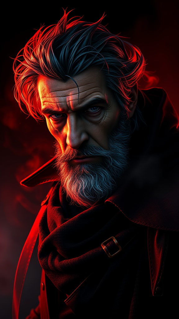 Highly detailed portrait of Pierce Brosnan as an aged mariner, envisioned by Dustin Nguyen, Akihiko Yoshida, Greg Tocchini, Greg Rutkowski, and Cliff Chiang. The scene is set in 4k resolution, drawing inspiration from both Dishonored and Bravely Default. A vibrant yet somber palette of deep reds, blacks, and whites dominates the composition. This epic, extreme long shot captures a dark, atmospheric mood accentuated by intense backlighting. Volumetric lights pierce through swirling smoke, creating a haunting ambiance. The artwork, rendered in high quality for ArtStation, employs the sophistication of Unreal Engine and Octane Renderer, delivering an 8K resolution where each detail is vividly brought to life. The creative vision culminates in a portrayal that is both dramatic and timeless, intertwining elements of chaos and tranquility.