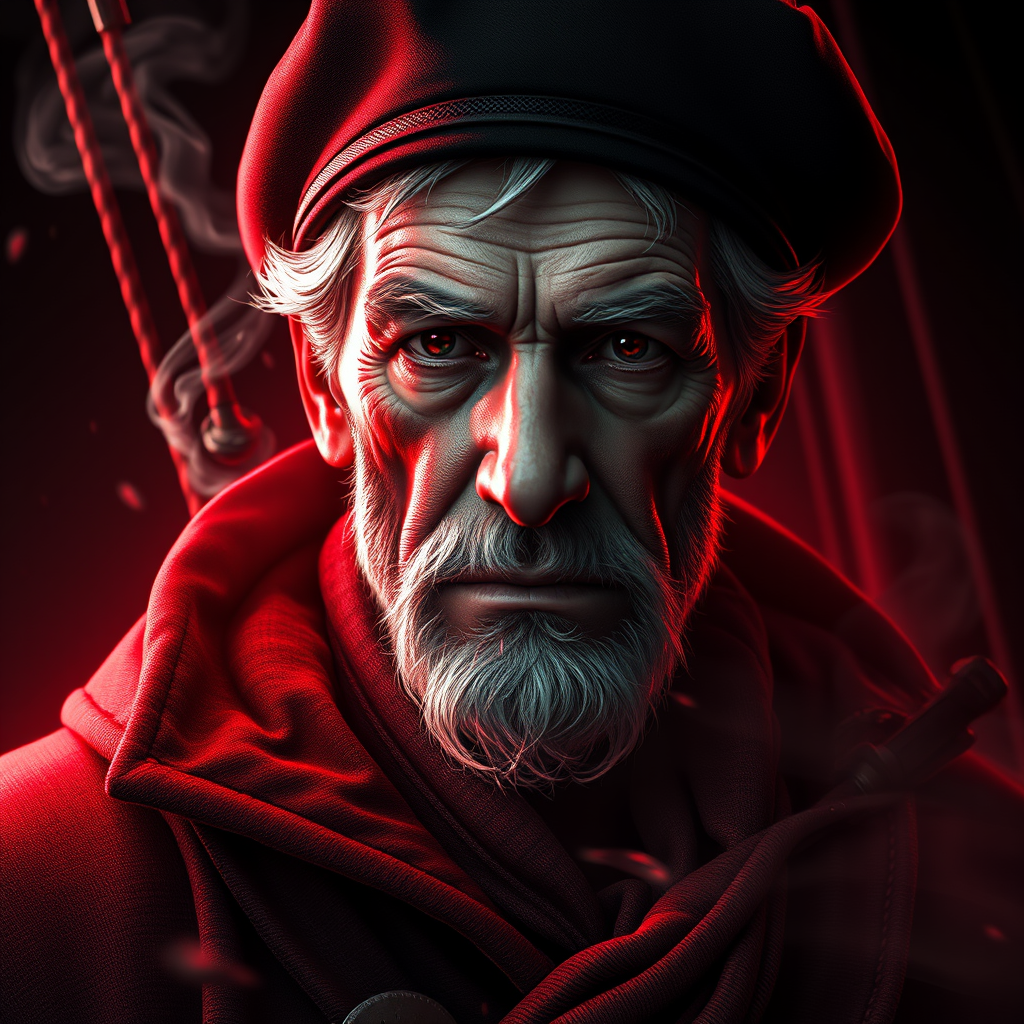 Highly detailed portrait of Pierce Brosnan as an old sailor, envisioned with the artistic styles of Dustin Nguyen, Akihiko Yoshida, Greg Tocchini, Greg Rutkowski, and Cliff Chiang. Captured in 4k resolution and inspired by the worlds of Dishonored and Bravely Default, the scene is vibrant yet drearily red, dominated by a black and white color scheme. The epic extreme long shot sets a dark and moody atmosphere enhanced by strong backlighting. Volumetric lights weave through the scene, mingling with smoke volutes. Rendered with Artstation HQ quality, utilizing Unreal Engine and Octane Renderer, this 8K masterpiece captures a haunting maritime mystique with a touch of whimsical creativity.