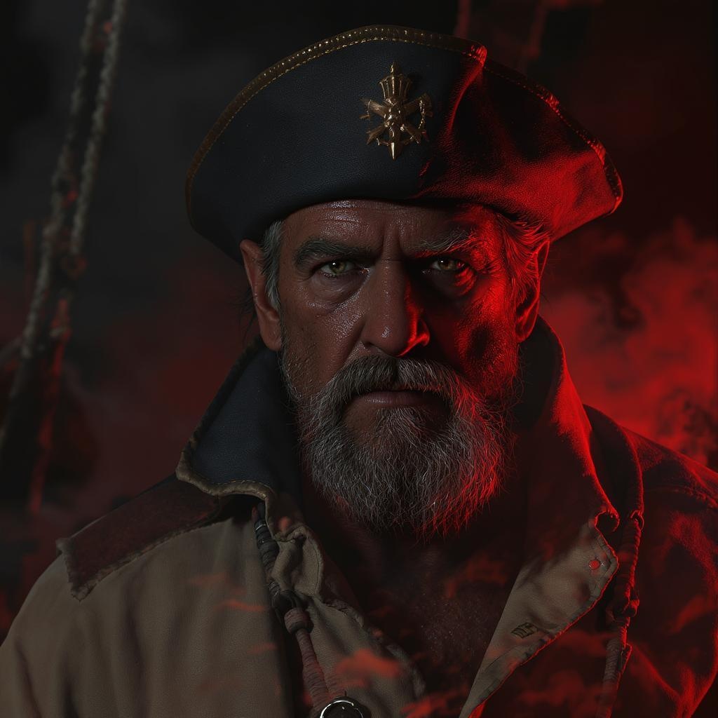 Highly detailed portrait of Pierce Brosnan as an old sailor, influenced by the artistic styles of Dustin Nguyen, Akihiko Yoshida, Greg Tocchini, Greg Rutkowski, and Cliff Chiang, captured in stunning 4k resolution. The scene draws inspiration from both the Dishonored and Bravely Default aesthetics, featuring a vibrant yet dreary palette dominated by reds, blacks, and whites. The composition features an epic extreme long shot with a dark, moody atmosphere, enhanced by strong backlighting. Volumetric lights cast dramatic shadows, while smoke volutes drift through the scene. Rendered in high quality, utilizing artstation HQ standards and optimized with unreal engine and octane renderer for breathtaking detail, it's completed in an exceptional 8K resolution.