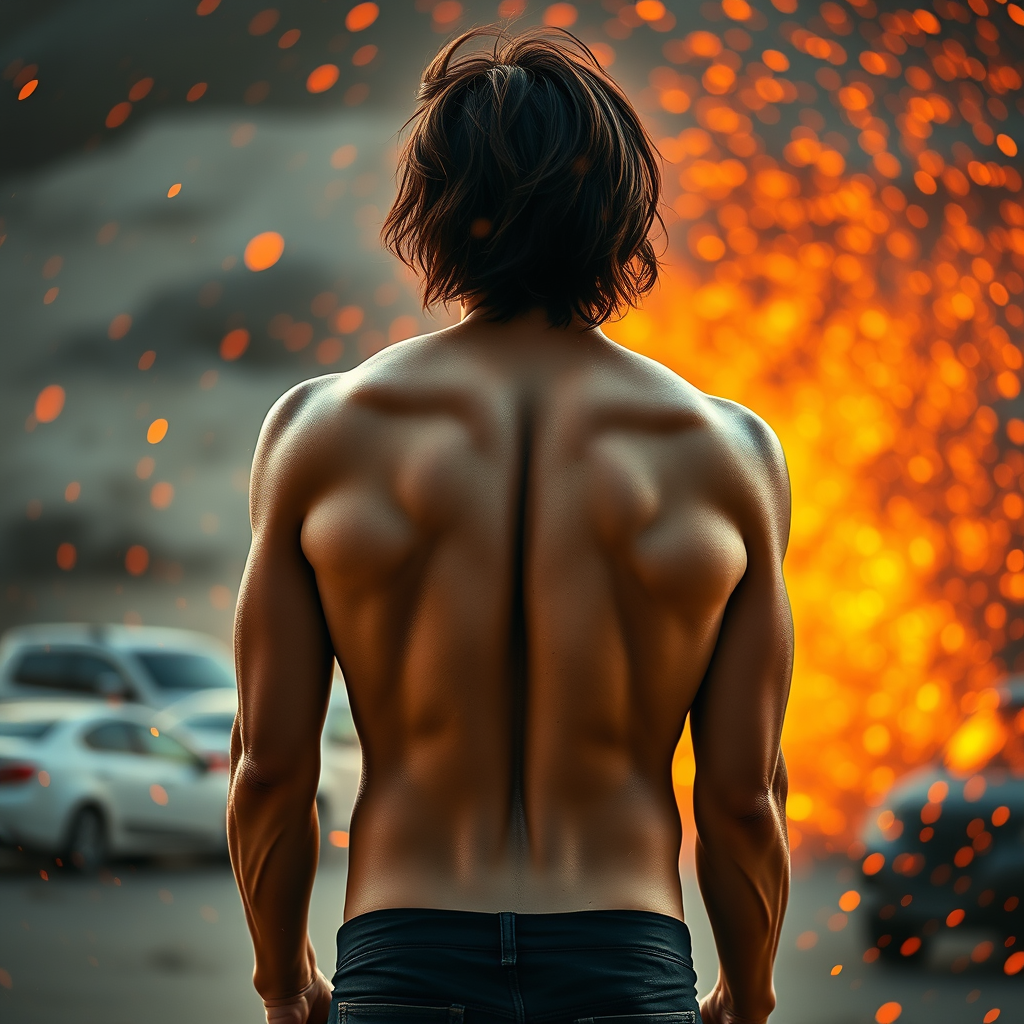 Highly detailed RAW color photo, back view, full body, outdoors, vivid details, athletic physique, prominent curves, with immersive particle effects, cinematic lighting with raytracing, shallow depth of field, captured on a Sony a9 II using a 35mm wide angle lens, sharp focus, resembling a cinematic film still, dynamic perspective, inspired by the visual style of Gravity 2013, showcasing an engaging and vibrant scene from behind.