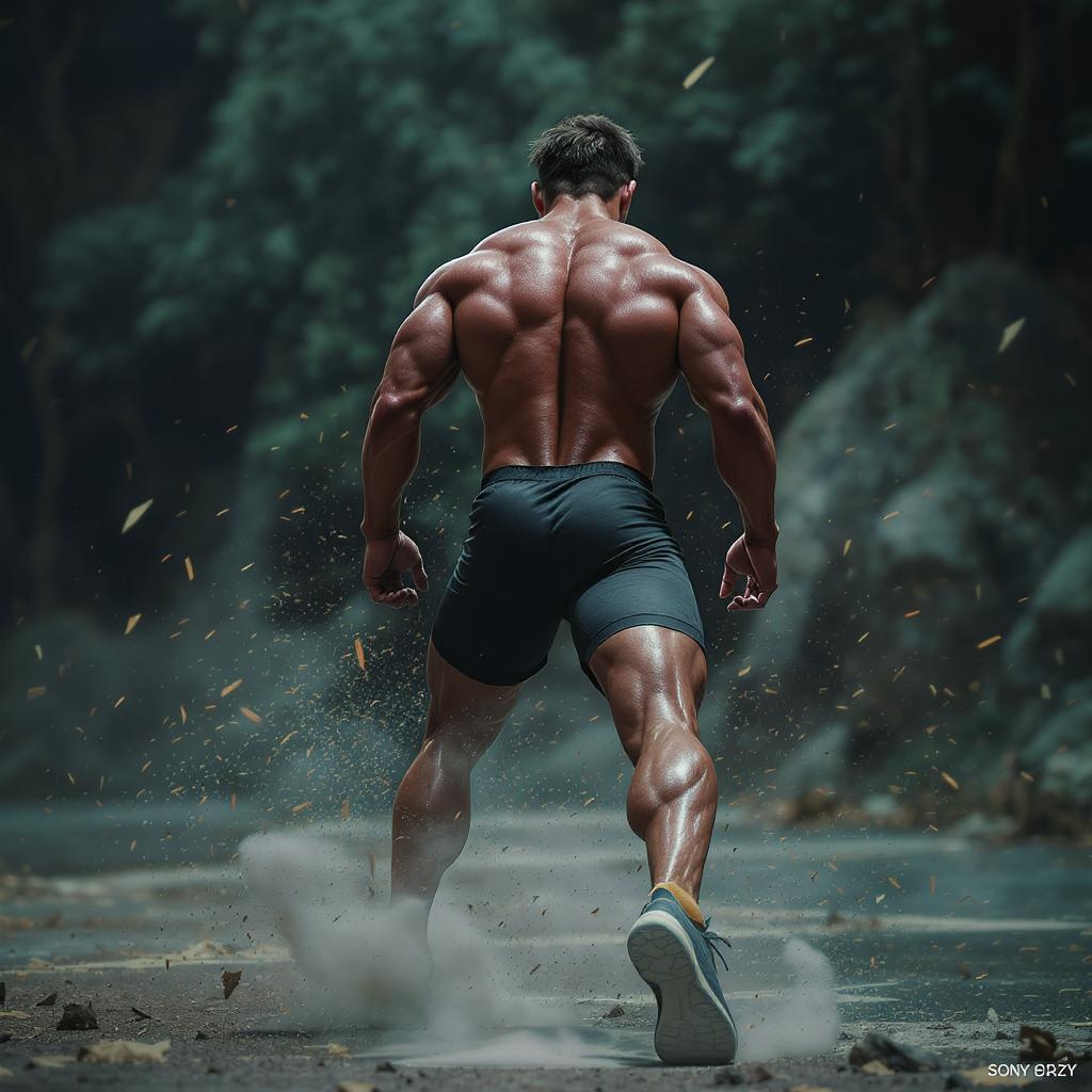 Highly detailed RAW color photo, rear angle, full body, of an athletic individual outdoors, with vivid detail and a sculpted physique, emphasizing strong legs and dynamic movement, surrounded by subtle particle effects, enhanced by raytracing and cinematic lighting, shallow depth of field, photographed on a Sony a9 II with a 35mm wide angle lens, maintaining sharp focus, evocative of a cinematic film still from a sci-fi movie, viewed from a dynamic and engaging angle.