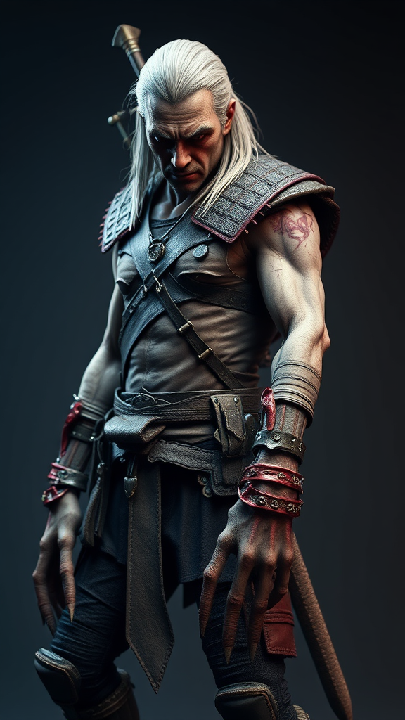 Highly detailed rendition of Geralt the Witcher, depicted in a full body shot with cinematic quality, 3D rendered to showcase intricate details and studio lighting. The image portrays an unusual and surreal version, with elements of poor anatomy and extra or missing limbs that give a sense of mutation. The limbs appear disconnected or floating, contributing to an overall mutated and distorted appearance. The result is both ugly and unsettling, with blurred sections and hints of amputation, enhancing the grotesque transformation. The composition challenges the viewer’s perception with its bizarre and intriguing aesthetic.