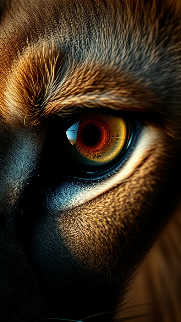 highly textured macro photography ultra-close-up of a lion's eye with evocative gaze, intense ferocity, and unbridled fury, conveying raw power and uncontainable energy through intensely realistic, photo-realistic, and highly detailed depictions of iris, pupil, and surrounding eyelid, set against a cinematic lighting backdrop with advanced perspective, imbuing the image with a seemingly four-dimensional quality of depth, rendering the subject in ultra-high detail, with photorealistic quality reaching 4k+, lens set to 1000mm, aperture f/1.4, shutter speed 1/5000s, ISO 100.