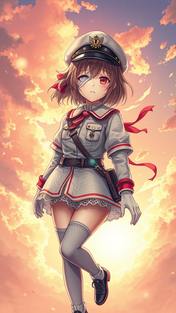 Hignity 8k wallpaper depicting an incredibly detailed scene on a simple background: a pencil drawing transformed into a colorful masterpiece. The character, a girl with a perfect face, stands with disheveled hair, a bandage over one eye, looking at the viewer with sad, detailed eyes. She is flying in the sunset sky amidst dynamic light particles and clouds. Wearing a finely detailed military uniform and hat, her outfit is adorned with lace and ribbons, complemented by stockings and white gloves. The scene captures a battlefield ambiance with a touch of game_cg aesthetic, embodying official art quality with a dynamic composition and motion. Her expression conveys a sense of solitude and beauty, heightened by intricate details and a sense of depth. The overall illustration combines elements of an ultra-detailed highres cover, evoking the feeling of an original, exquisite wallpaper with a perfectly balanced mix of color and emotion.