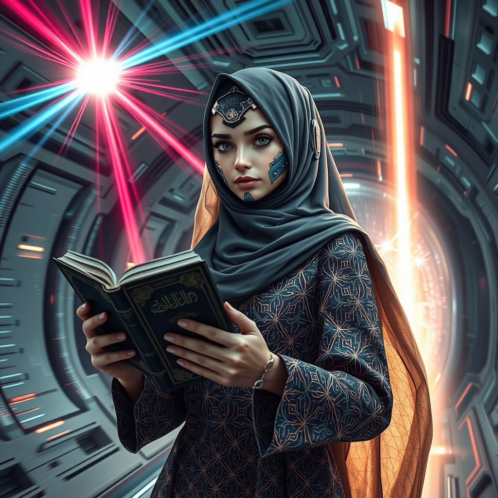 Hijabi girl with cyberpunk prosthetics, holding a Quran, wearing an intricately designed Islamic dress, long flowing hair, inside a futuristic spaceship, hyper-detailed and photorealistic sci-fi atmosphere, vibrant laser beams crisscrossing from above, surrounded by swirling energy clots, painted with cinematic flair, captured in 8K and HD super resolution, capturing the essence of speed and acceleration, with a brilliant flash of light illuminating the scene.
