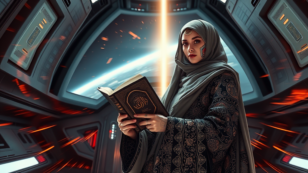 Hijabi girl with cyberpunk prosthetics, holding the Quran, wearing intricate Islamic attire, long flowing hair, standing inside a spaceship with a futuristic design. The scene is highlighted by a central laser beam, extending from the sky, surrounded by swirling energy clots. The atmosphere is sci-fi inspired, with hyper-realistic details capturing a dynamic sense of speed and acceleration. The setting is cinematic, with a photorealistic style in 8K super resolution. Long exposure effects create a dramatic light flash, enhancing the ultra-high definition imagery.