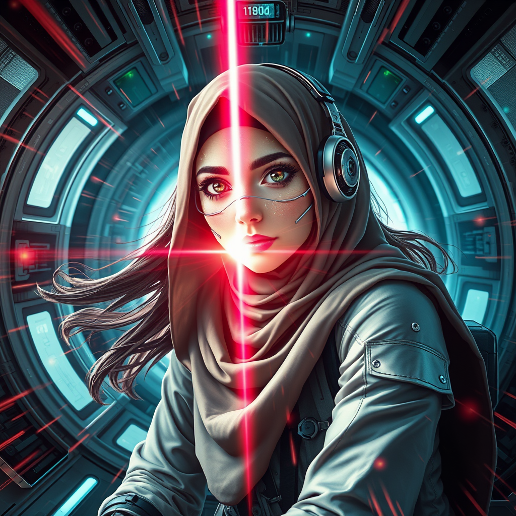 Hijabi Muslim girl with cybernetic enhancements, adorned in futuristic Islamic attire, flowing hair, situated inside a high-tech spaceship, featuring a modern sci-fi aesthetic, intricately detailed with a laser focal point in the center, beams descending from above, surrounded by energy orbs, photorealistic imagery, dynamic realism, evoking a sense of acceleration, radiant light bursts, conveying velocity, emulating a vivid painting, in 8K Ultra HD, with super resolution, offering a cinematic experience, utilizing long exposure techniques, emphasizing detail and clarity, super-resolution with atmospheric laser effects.