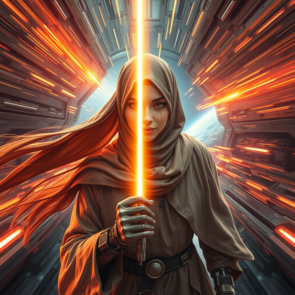 Hijabi Muslim woman with cybernetic prosthetics, dressed in traditional Islamic attire, flowing long hair, set inside a futuristic spaceship, embodying advanced sci-fi elements, intricately detailed, central pulsating laser, beams descending from the sky, energetic plasma formations, photorealistic and hyper-realistic textures, evoking speed with vibrant light flashes, captured as in a dynamic painting, high definition 8K resolution, cinematic with long exposure effects, capturing motion and acceleration, enveloped in super-resolution visuals.