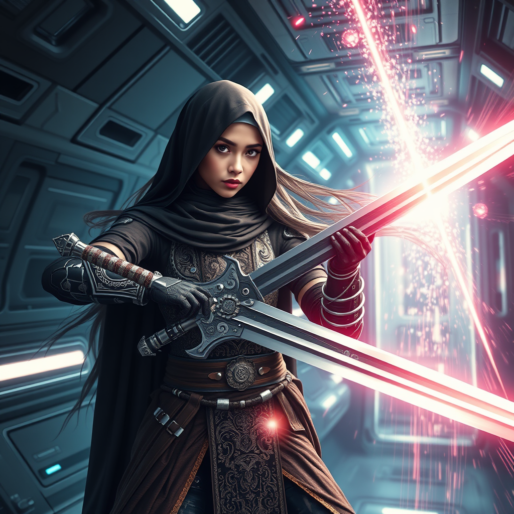 Hijabi warrior girl with advanced cybernetic prosthetics holding an intricately designed sword, dressed in ornate Islamic attire, her long hair flowing dramatically. Set within a sleek spaceship interior that exudes a futuristic and sci-fi atmosphere, the scene is hyper-detailed and photorealistic. A powerful laser beam emanates from the center, synchronized with a laser descending from above, intertwining with vibrant energy clots. The composition captures the essence of hyper realism, featuring breathtaking acceleration and flashes of light, conveying a sense of dynamic speed. The painting is rendered in super-resolution 8K HD, presenting a cinematic feel with long exposure to emphasize motion and intensity, crafted in ultra-high definition.