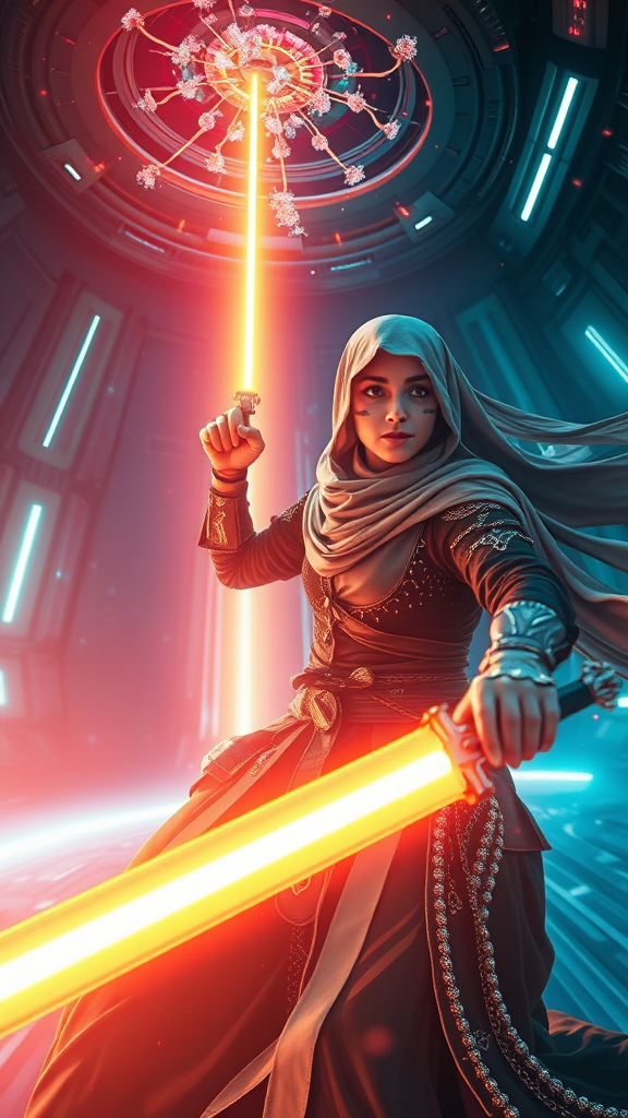 Hijabi warrior girl with cyberpunk enhancements wielding a glowing sword, clad in elaborate Islamic attire with flowing long hair, set within the vast interior of a futuristic spaceship. The scene is infused with a remarkable sci-fi atmosphere, showcasing hyper-detailed photorealism. A powerful laser beams through the center of the image, connecting with an energy source above as vibrant energy clots surround her. The environment conveys an intense sense of speed and acceleration, captured in a cinematic style with long exposure effects. High-definition super-resolution brings the scene to life, highlighting every intricate detail in stunning 8K clarity.