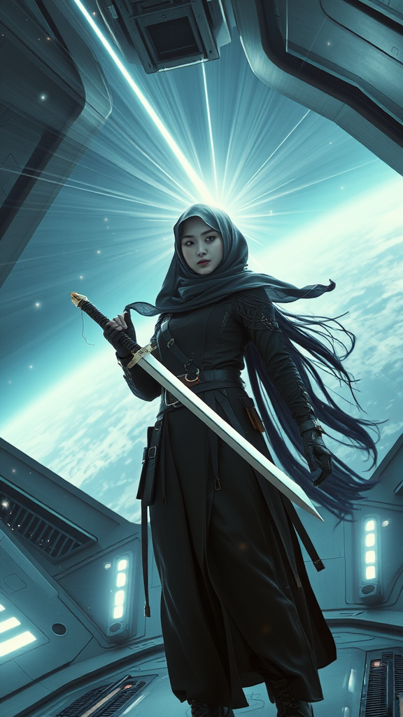 Hijabi warrior girl with cyberpunk prosthetics wielding a sword, wearing a fusion of Islamic dress and futuristic attire. Her long hair flows as she stands inside a sleek spaceship, surrounded by a sci-fi, hyper-detailed environment. A radiant laser beams from the sky, converging in the center, illuminating the scene with energy clots sparkling around. The setting captures a sense of acceleration and motion, with light flashing intensely, creating a dramatic speed effect. The image is captured in photorealism and hyper-realism, with 8K, HD, and super-resolution quality. The scene is cinematic, with an emphasis on long exposure and dynamic light interplay, exuding a high-tech, futuristic ambiance.