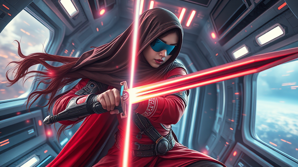 Hijabi warrior girl with cyberpunk prosthetics wielding a sword, dressed in futuristic Islamic attire, her long hair flowing amidst a spaceship's interior. The scene boasts a futuristic sci-fi aesthetic, intricately detailed, with a laser beam piercing through the center and another descending from the sky, surrounded by dynamic energy clots. Photorealism merges with hyper-realism, capturing the essence of acceleration, light flashes, and high-speed motion. The image resembles a cinematic painting, captured in 8K HD super resolution, emphasizing the dramatic play of long exposure and vibrant details, showcasing the fusion of tradition and technology.