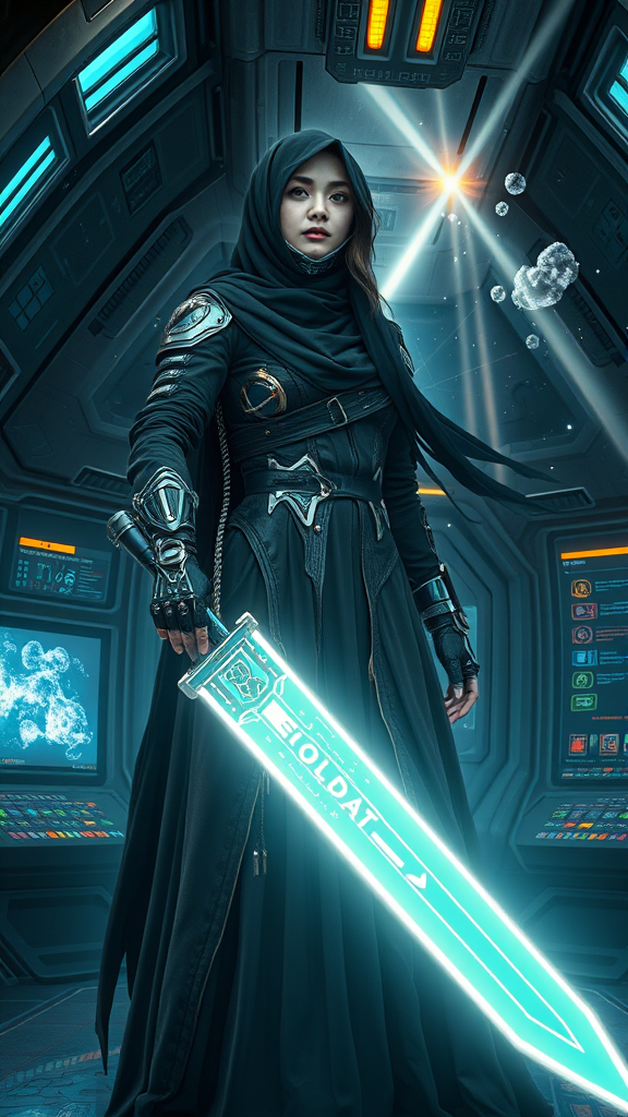 Hijabi warrior girl with cyberpunk prosthetics wielding a glowing sword, dressed in futuristic Islamic attire, with flowing long hair. She stands inside a sleek, dimly lit spaceship, surrounded by intricate control panels and glowing holographic displays. Outside, beams of light from the sky intersect with energy clots, creating a dynamic, otherworldly spectacle. The scene is captured in hyper-detailed photorealism, showcasing a fusion of traditional and futuristic design. Accelerated moments of movement and flashes of light highlight the intensity of her presence, with cinematic elements lending a dramatic flair. The composition is captured in 8K resolution, emphasizing the intricate textures and vivid colors, reminiscent of a high-definition sci-fi painting.