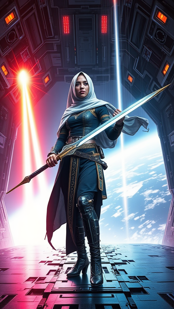Hijabi warrior girl with cyberpunk prosthetics, wielding a gleaming sword, dressed in intricately detailed Islamic attire, her long hair flowing, standing boldly inside a vast spaceship. The setting is a futuristic, sci-fi universe where photorealistic, hyper-detailed elements shine. A powerful laser beam dominates the center, cutting through the scene with intensity, while another descends dramatically from the sky. Pulsing energy clots ripple through the air, creating a sense of unstoppable acceleration and dynamic light flashes. The entire scene is a vivid painting rendered in 8K HD super resolution, capturing a cinematic essence with long exposure that highlights speed and movement in a high-definition, super-resolved portrayal.