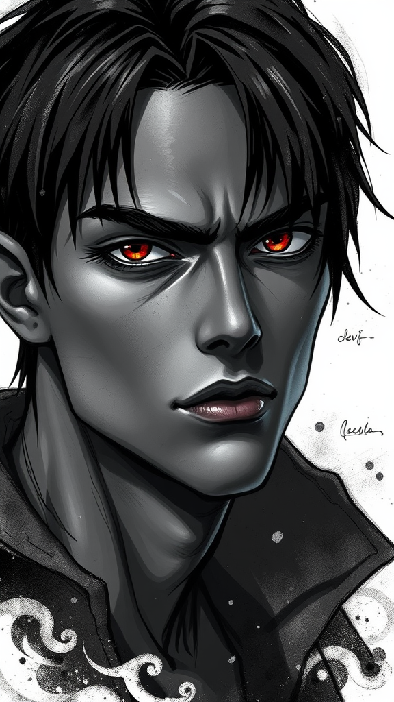 HIPER DETAILED PORTRAIT OF Levi Ackerman | Attack on Titan, INTENSE EXPRESSION, SHORT HAIR, CLEAN SHAVEN, deep skin tones, highly detailed skin, digital painting essence. Incorporate elements inspired by a powerful black woman and an enigmatic Chinese woman. Monochrome palette, black and white focus. Maintain an illustration style that hints at realism but embraces a slight abstract touch. Infuse depth with piercing red eyes and rich brown hair, blended with textured African hair elements. Emphasize a strong presence with a long neck. Aim for a raw, textured, and evocative portrayal, ensuring artistic integrity and captivating features.