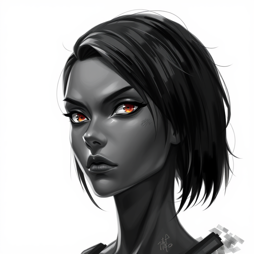 HIPER DETAILED PORTRAIT OF Levi Ackerman-inspired character from Attack on Titan, portraying an intense expression with short hair and a clean-shaven, deeply textured skin. The character blends features reminiscent of a strong black woman and a poised Chinese woman. The artwork is a digital painting merging monochrome elements with subtle color details, focusing on raw emotion and intricate facial details. The eyes are piercingly expressive with an intense hue, while the hair combines distinct textures resulting in a unique and striking visual. The elongated neck adds grace, while maintaining a realistic and cohesive anatomy. The portrait boldly experiments with character interpretation without compromising on artistic quality.