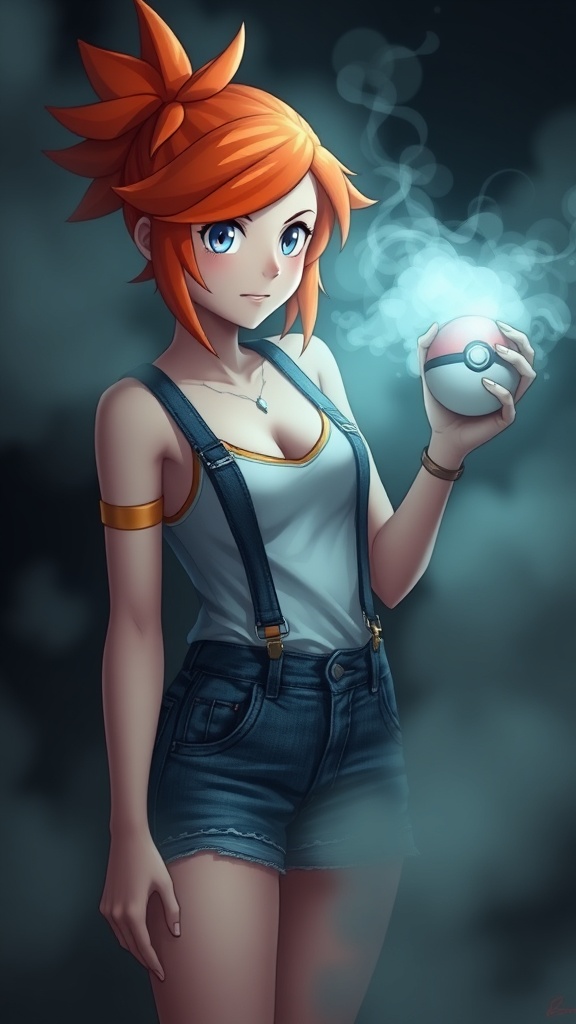 View this AI-generated image featuring a scene with misty from pok mon holding a pokeball enveloped in a mysterious fog she has vibrant orange hair styled in her iconic look misty is wearing a tank top with suspenders paired with low waisted jean shorts showcasing her sporty and adventurous spirit h