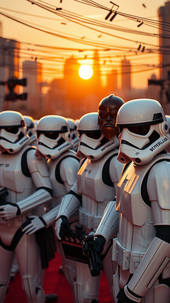 Hollywood celebrities as stormtroopers, blurred in the background, with silhouettes of iconic movie cameras and clapperboards, amidst a cityscape at sunrise, like a galaxy far, far away, with Carrie Fisher as a lead stormtrooper, Chewbacca photobombing as a paparazzo, and Harrison Ford expressing disillusionment behind his Mandalorian armor, all underneath dramatic laundry line cables resembling space debris, amidst a galaxy-spanning movie premiere stage.