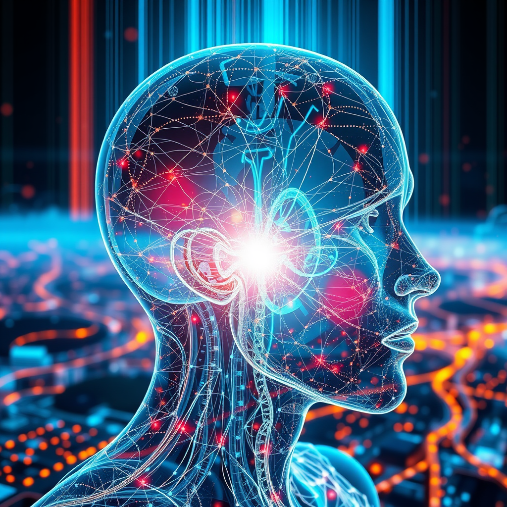 Holographic digital art masterpiece featuring a humanoid form integrated into a vibrant digital landscape, showcasing intricate neural network patterns and sound wave elements reflecting a symphony of big data and high technology. Captured in 32k UHD resolution, this professional close-up photography offers a high-quality depiction of the future's fusion of technology and art.