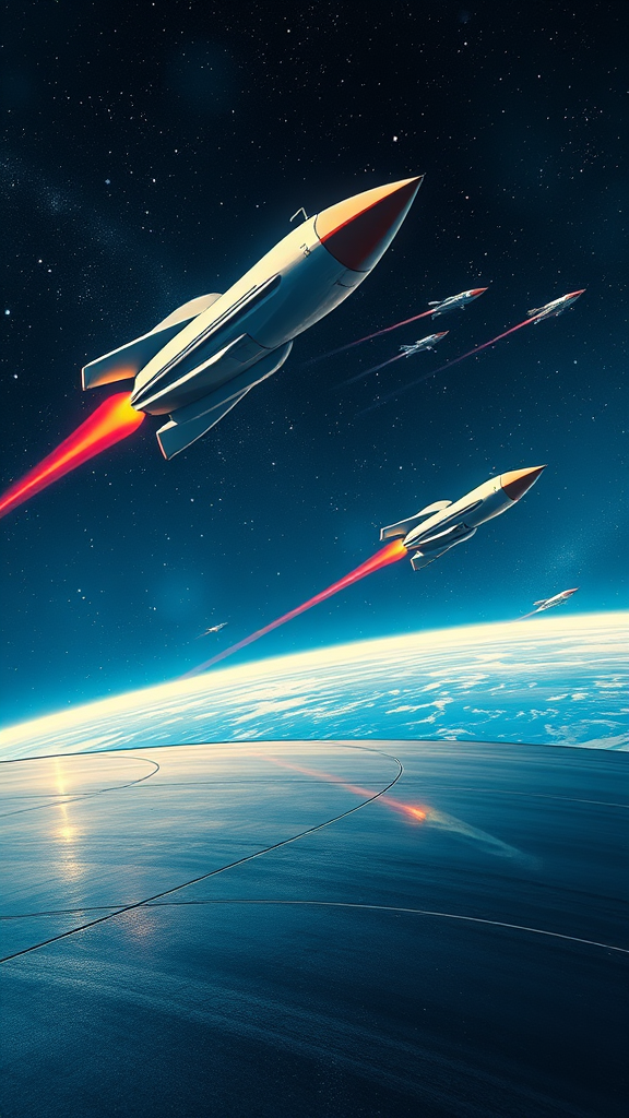 Homage to 1950s Old Time Science Fiction Illustration of Space Travel, featuring sleek, retro-futuristic rocket ships gliding against a vast star-studded cosmos. The scene captures the elegant curves and grandeur of vessels as they soar through a vibrant, deep blue sky illuminated by distant galaxies. The foreground is a smooth, metallic platform reflecting the dazzling array of colors from space, enhancing the enchanting feel of adventure and discovery. The aesthetic echoes the style of Bruce Pennington, with meticulous details and vivid color. Taken with a Kodak Master View 8x10 camera, using a Fujinon C 240mm f/9 lens and Kodak Ektar 100 film, the image captures the high dynamic range and sharpness typical of 4k, UHD, HDR prints.