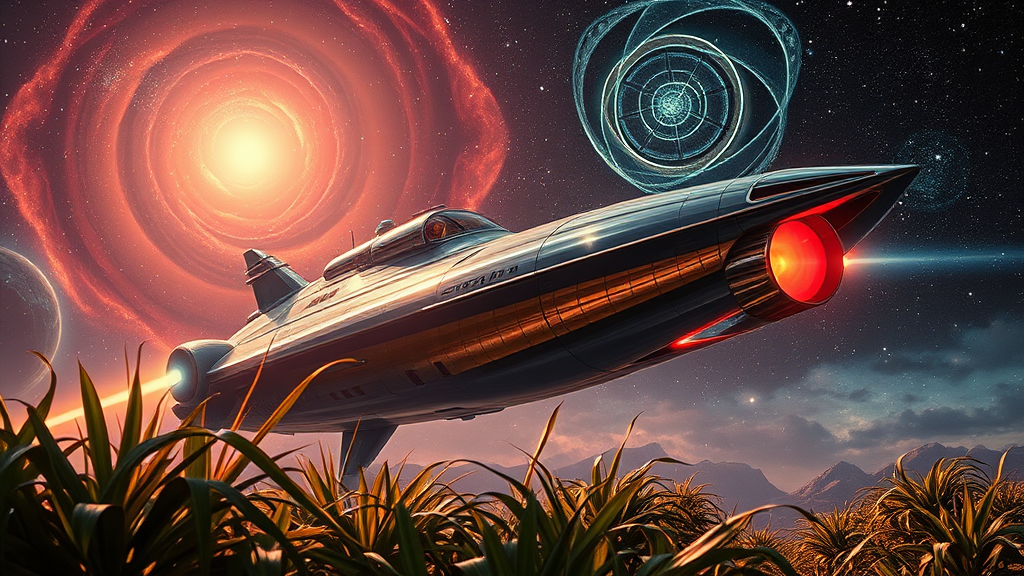 Homage to 1950s retro science fiction illustration of space exploration, featuring a sleek interstellar spacecraft with gleaming chrome accents and vibrant, glowing propulsion systems. In the foreground, lush alien vegetation sways gently under a shimmering, otherworldly sky filled with swirling galaxies and distant stars. The scene is illuminated by an ethereal light, casting soft reflections on the ship's surface. The overall atmosphere evokes a sense of wonder and adventure with its rich, vivid colors and finely detailed imagery, reminiscent of Bruce Pennington's iconic style. Captured with a camera setup that includes a Kodak Master View 8x10 and Fujinon C 240mm f/9 lens, utilizing Kodak Ektar 100 film to enhance the scene's dynamic range and depth.