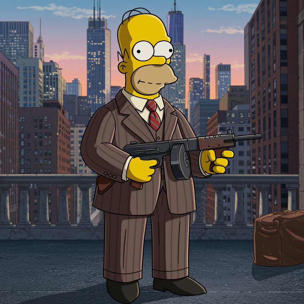 Homer Simpson adorned in a sleek Gucci suit, exuding the aura of a 1930s Mafia gangster, clutching a tommy gun with an air of cool confidence against the bustling backdrop of New York City skyscrapers.